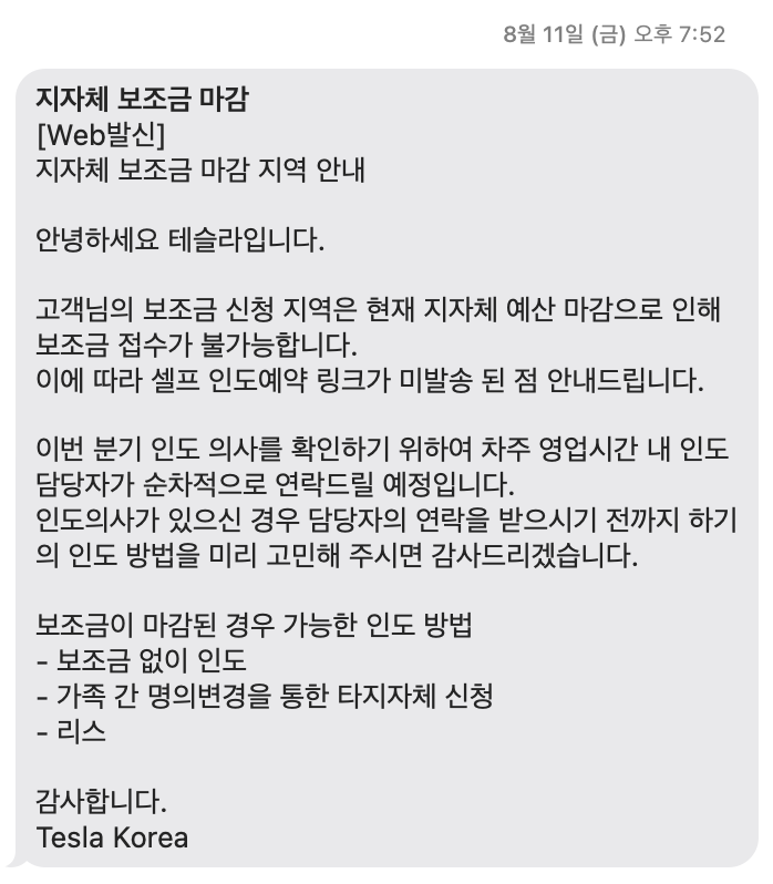 이 사실 때문에 테슬라에서는 보조금 안 받고 출고를 할 수도 있다는 사실을 알려준다...