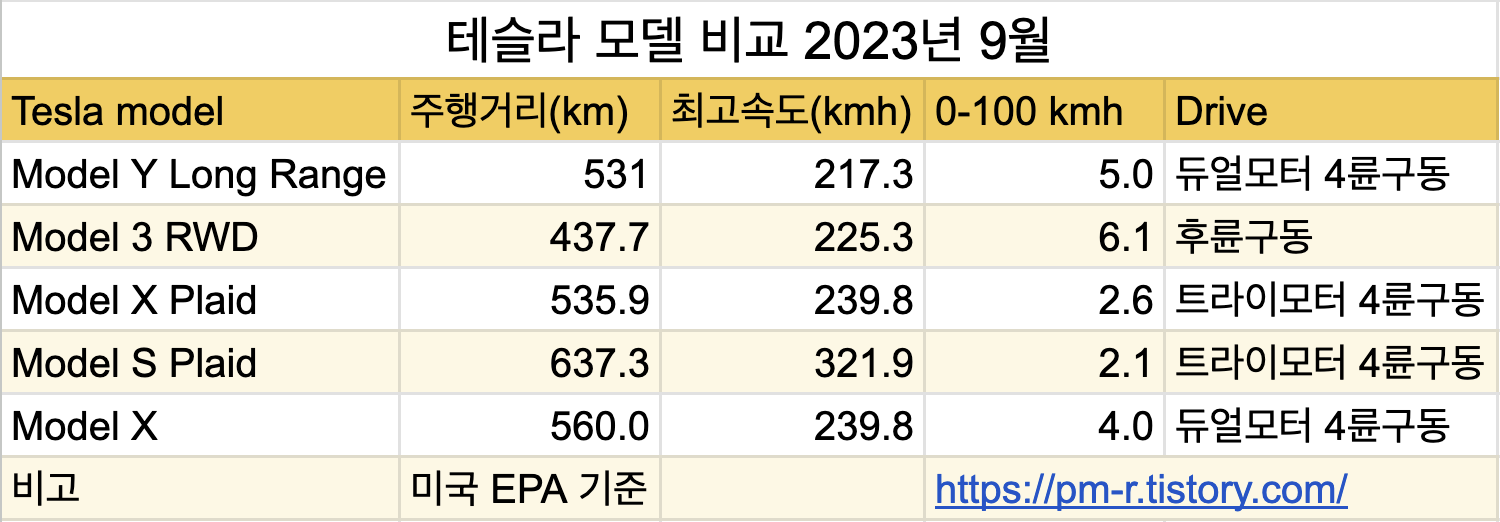 테슬라에는 모델 S, X, 3, Y의 4가지 인기 차종이 있습니다.