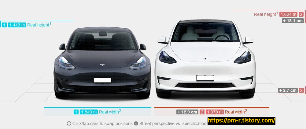 다음은 모델 Y와 3의 앞면 비교입니다.